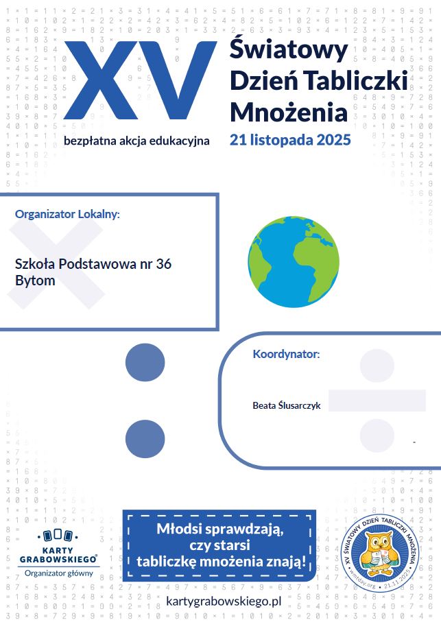 W 2025 roku Światowy Dzień Tabliczki Mnożenia przypadł na 21 listopada (piątek). Uczniowie w radosny sposób przypominali sobie tabliczkę mnożenia, uczestnicząc w różnorodnych grach i zabawach. Kulminacyjnym momentem był egzamin, gdzie każdy, kto chciał sprawdzić swoją znajomość tabliczki mnożenia, losował zestaw pięciu pytań. W każdej klasie został wyłoniony uczeń, który otrzymali zaszczytny tytuł „Eksperta tabliczki mnożenia”.